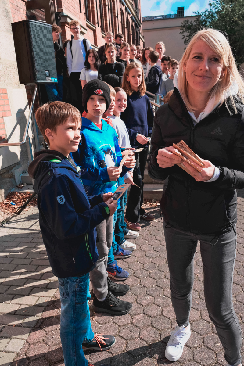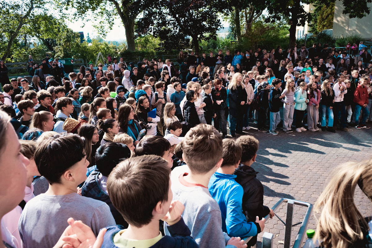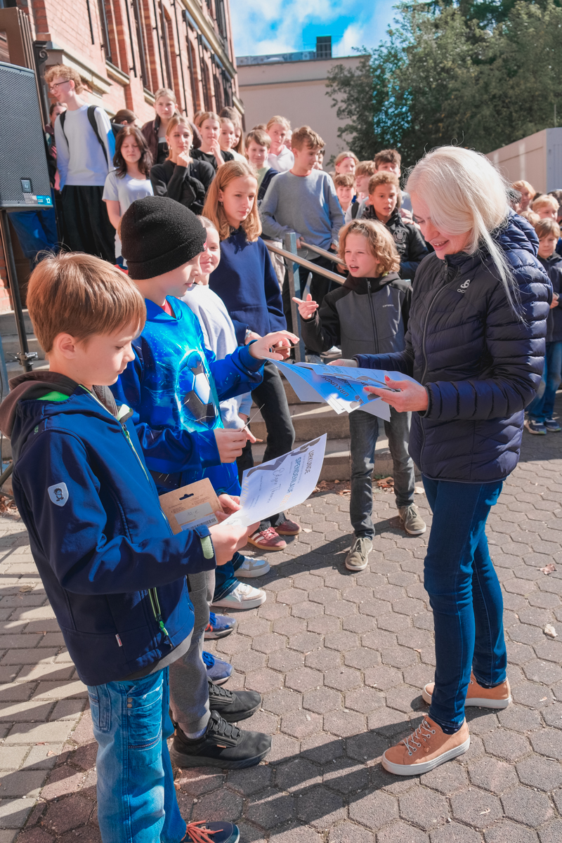 Kurz vor den Ferien sollte nun neben der beachtlichen Spendensumme auch die sportlichen Leistungen der Läuferinnen und Läufer in einem besonderen Rahmen gewürdigt werden. Dazu versammelte sich die gesamte Schule am Ende des dritten Blocks auf dem hinteren Schulhof, um die besten Läuferinnen und Läufer sowie die drei erfolgreichsten Klassen zu ehren.